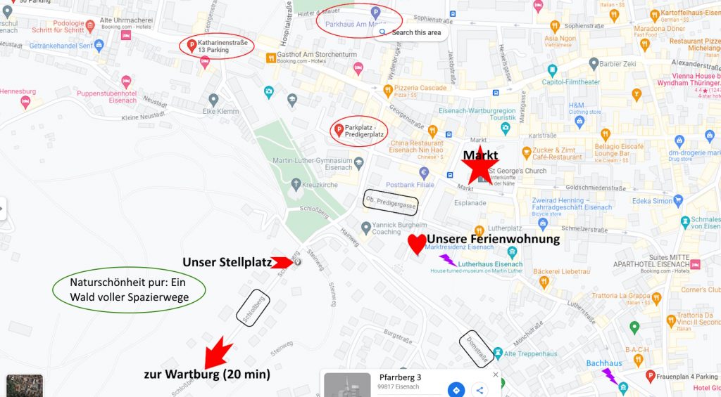Des Weiteren besteht die Möglichkeit, Ihr Auto auf dem Markt oder den umliegenden Straßen zu parken, allerdings fallen dort höhere Parkgebühren an. Das nächstgelegene Parkhaus ist das Parkhaus am Markt (siehe Karte). Alternativ gibt es auch kostenfreie Parkplätze in der Katharinenstraße. Eine Übersicht über die Parkmöglichkeiten in Eisenach finden Sie hier. Informationen zu den jeweiligen Kosten finden Sie auf den Parkhausseiten.
